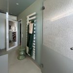 Aus 1 mach 2: Ein sehr großes Badezimmer wird in zwei getrennte Räume geteilt. Die Duschzone im Masterbad wird durch einen Dallmer Pumpenablauf bodenbündig möglich.