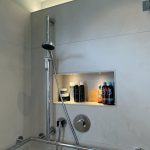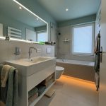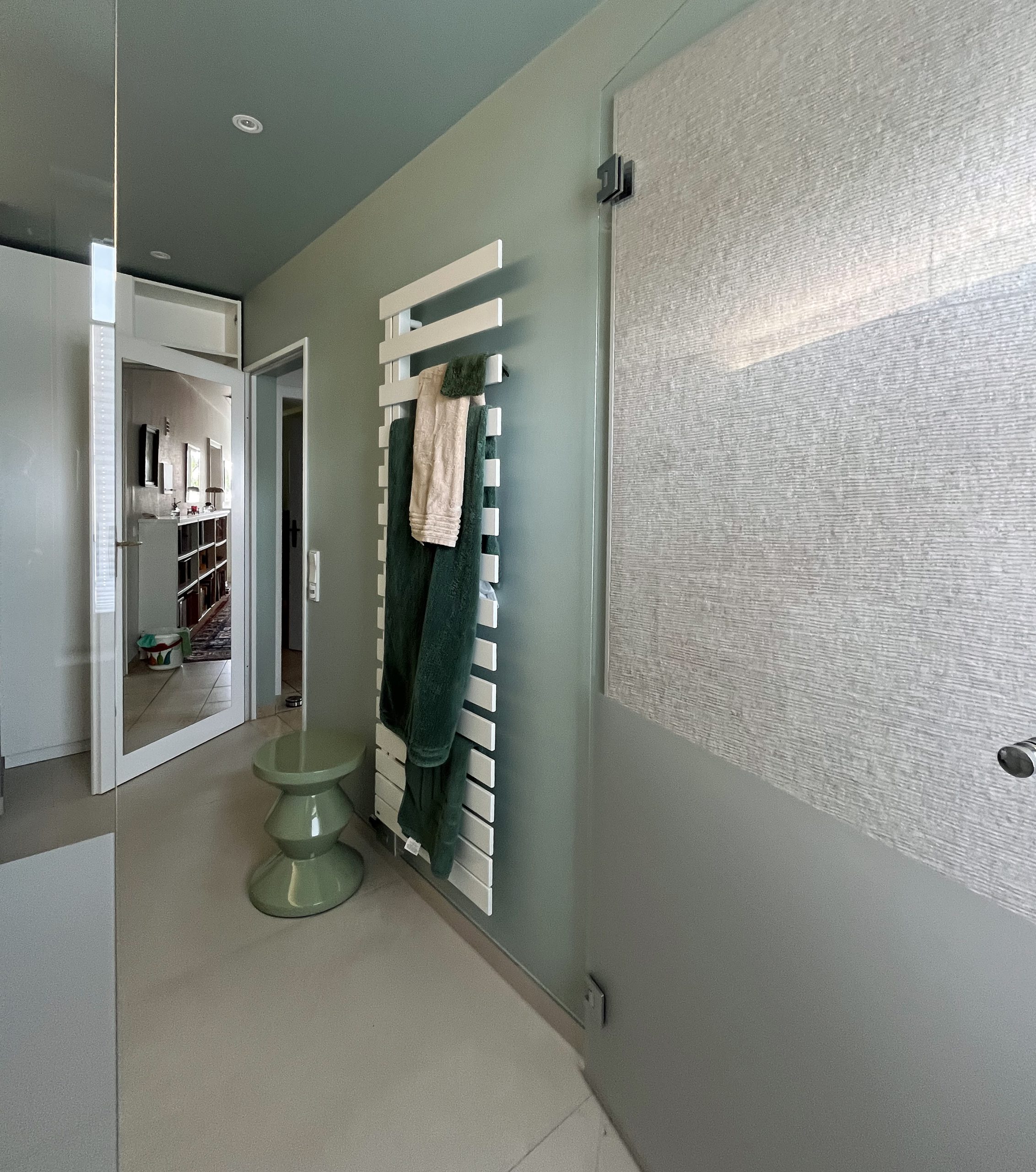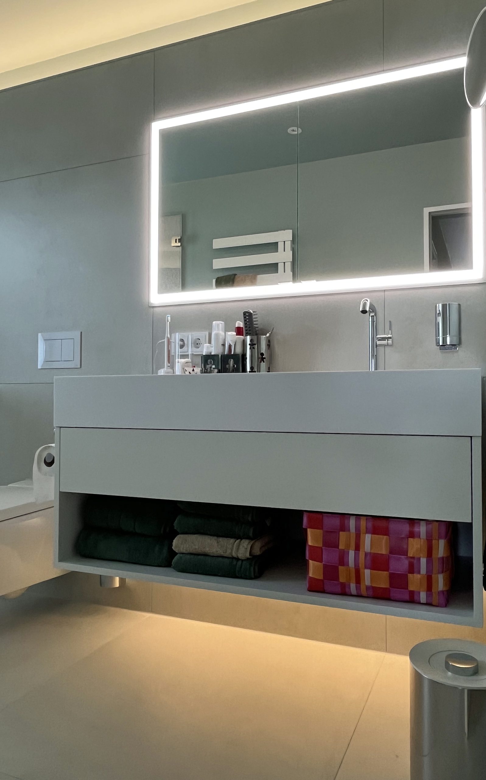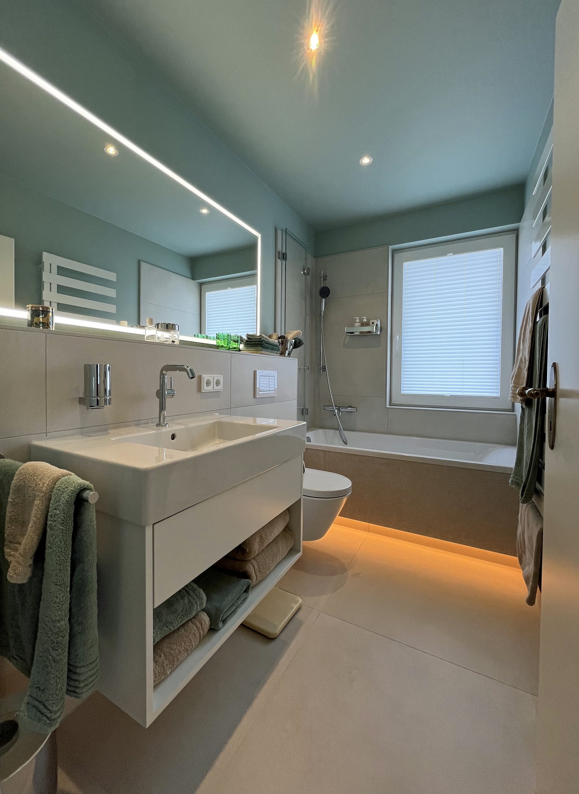 Das bestehende Bad wurde neu interpretiert: mit großzügiger Dusche, mehr Platz am Waschplatz und einer warmen, natürlichen Farbwelt. Großformatfliesen in Stein- und Holzoptik, durchdachte Lichtakzente und eine grüne Wand sorgen für Komfort und gute Laune.