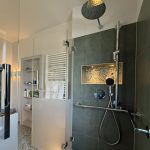 Das bestehende Bad wurde neu interpretiert: mit großzügiger Dusche, mehr Platz am Waschplatz und einer warmen, natürlichen Farbwelt. Großformatfliesen in Stein- und Holzoptik, durchdachte Lichtakzente und eine grüne Wand sorgen für Komfort und gute Laune.