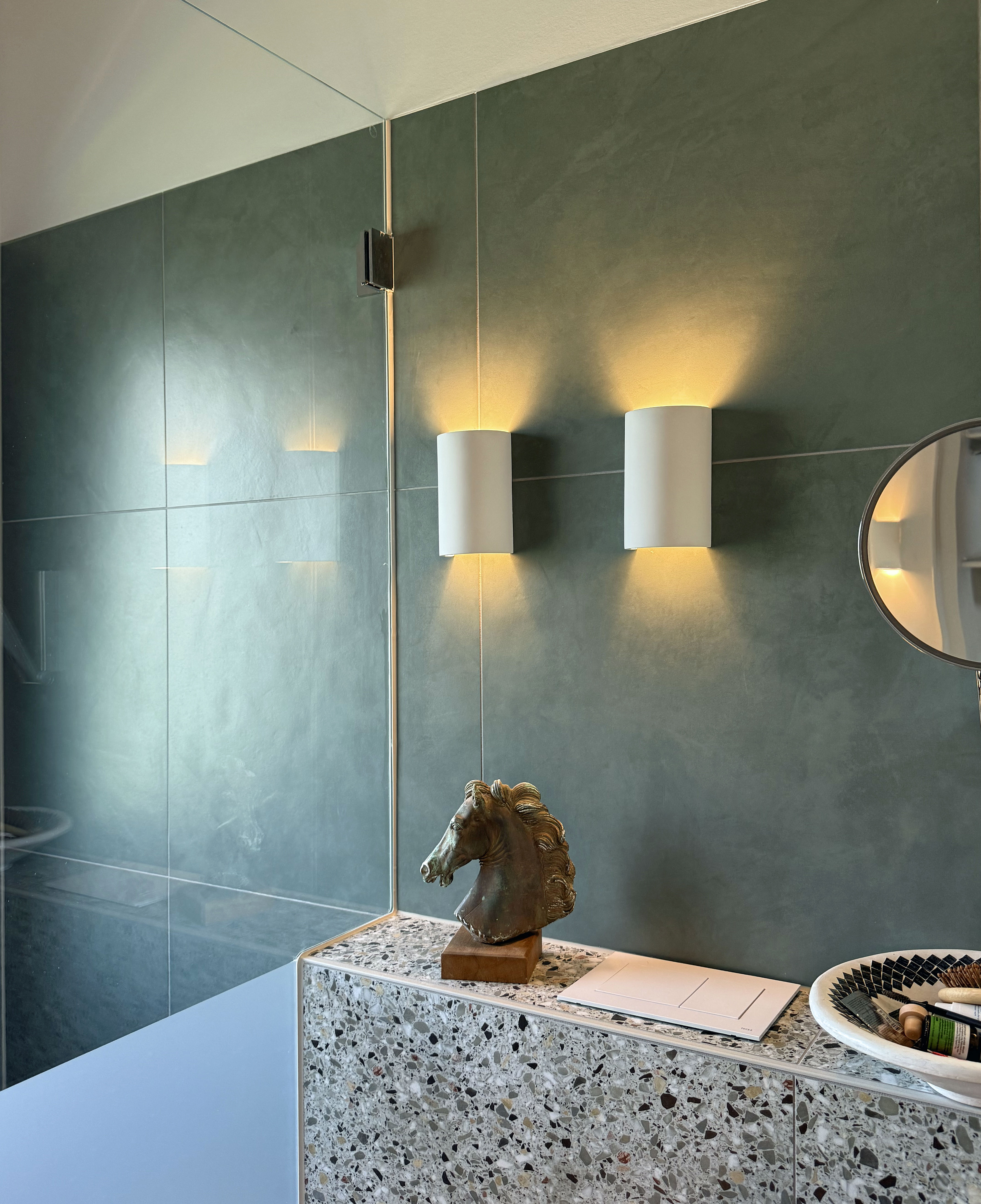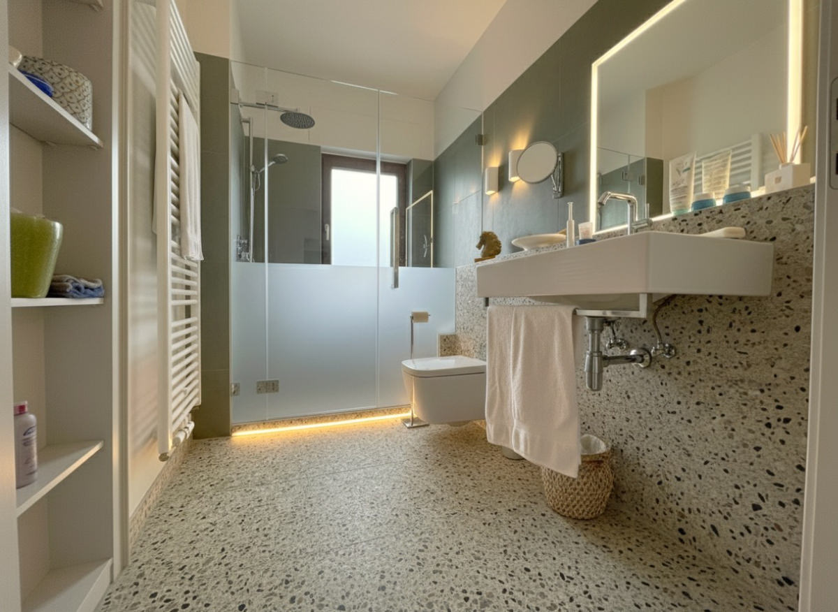 Ein charakterstarkes Bad erhält ein zeitgemäßes Update das Terrazzo, grünes Feinsteinzeug und eine durchdachte Lichtplanung miteinander vereint. Barrierearme Details und harmonische Gestaltung schaffen ein schlichtes und zugleich einladendes Badezimmer.
