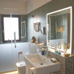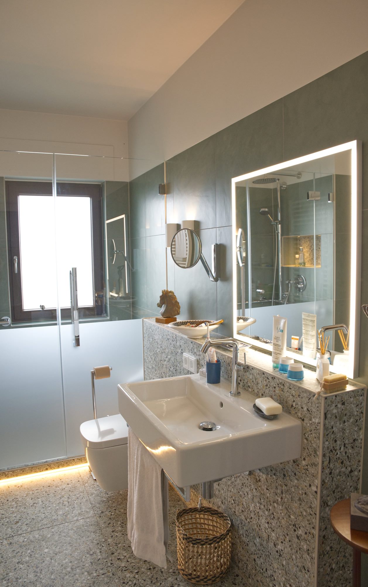 Das gelingt mit den Terrazzofliesen in Kombination mit grünen Feinsteinzeug und einer perfekt aufeinander abgestimmten Detailplanung. Die Krönung der Raumgestaltung stellt die angenehme Lichtgestaltung dar. Ein großer, rundum beleuchteter Spiegel dient als Hauptlichtquelle und wird von zwei Leuchtenpärchen an der Wand unterstützt – wenn gewünscht. Die Stufe zur Duschzone wird von außen geschaltet und dient nicht nur nachts, sondern auch für gemütliche Stunden als Raumlicht.